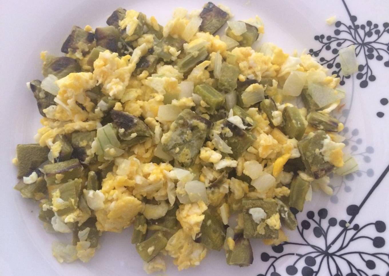 - En un sartén ponemos un poquito de aceite, ya caliente el aceite agregamos el huevo, la cebolla, el nopal y sal, revolvemos hasta que se cocine el huevo.